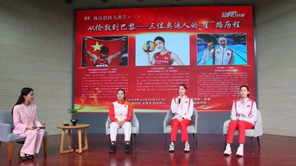 11月20日下午,2024年度体育思政大讲堂暨团委信仰公开课在卫岗校区大学生活动中心开讲。前中国田径100米栏选手孙雅薇、中国女排国家队主力二传刁琳宇和巴黎奥运会花样游泳冠军王赐月三位运动员应邀来到现场与我校师生开展交流互动。