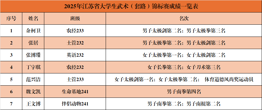 近日,2025年江苏省大学生武术(套路)锦标赛在扬州大学举办。我校高水平武术队凭借扎实功底与顽强毅力,共斩获2金6银4铜的优异成绩,教练白茂强被评为“优秀教练员”。