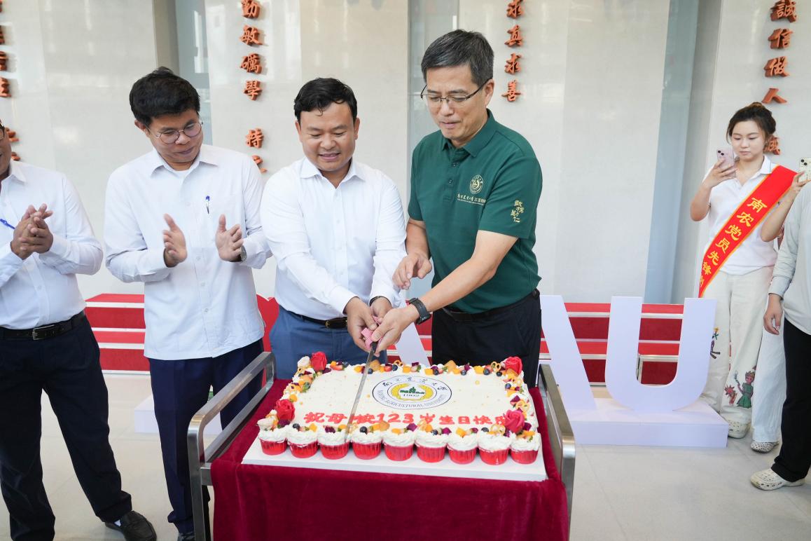 在“南农宴”上,南农烧鸡、盐水鸭、菊花茶、芒果酒、冰皮月饼、自制芒果冰淇淋等特色美食获得来宾一致好评。王源超与萨尤·索法普科亚共同切开了123周年校庆蛋糕,中柬双方代表与师生校友合影留念。