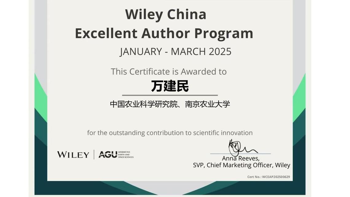近日,万建民院士团队收到国际著名出版社Wiley的邮件通知与证书,发表于《THE PLANT JOURNAL》期刊中的论文《Genome‐wide association and selection studies reveal genomic insight into saline‐alkali tolerance in rice》受到全球学者广泛关注,被Wiley出版社授予“Wiley 威立中国高贡献作者奖”。