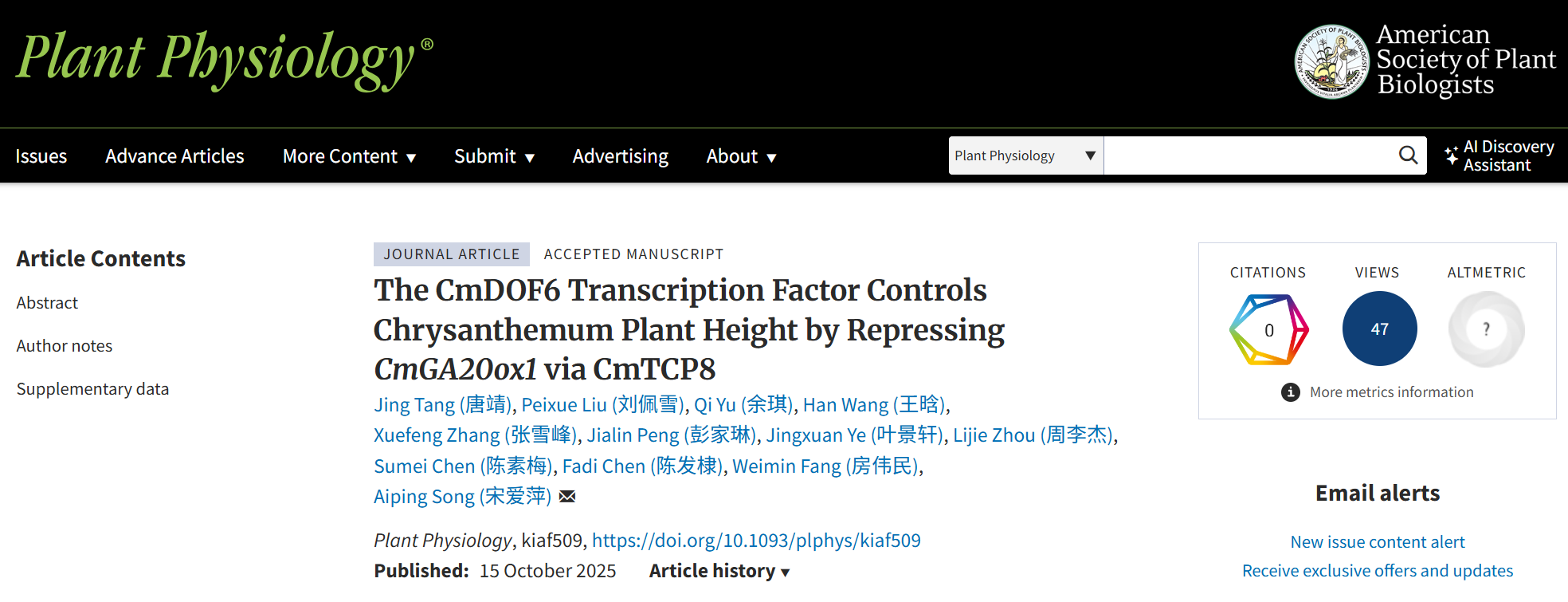 株高是评价植物株型的关键指标之一,影响了植物的适应性和生态位。团队前期研究发现DOF转录因子家族成员CmDOF6可能参与了菊花株高的调控,但分子调控机制不清。题为“The CmDOF6 Transcription Factor Controls Chrysanthemum Plant Height by RepressingCmGA20ox1 via CmTCP8”的研究论文,揭示了菊花CmDOF6借由“CmDOF6-CmTCP8-CmGA20ox1”路径,通过抑制赤霉素(GA)合成来调节植物株高。
