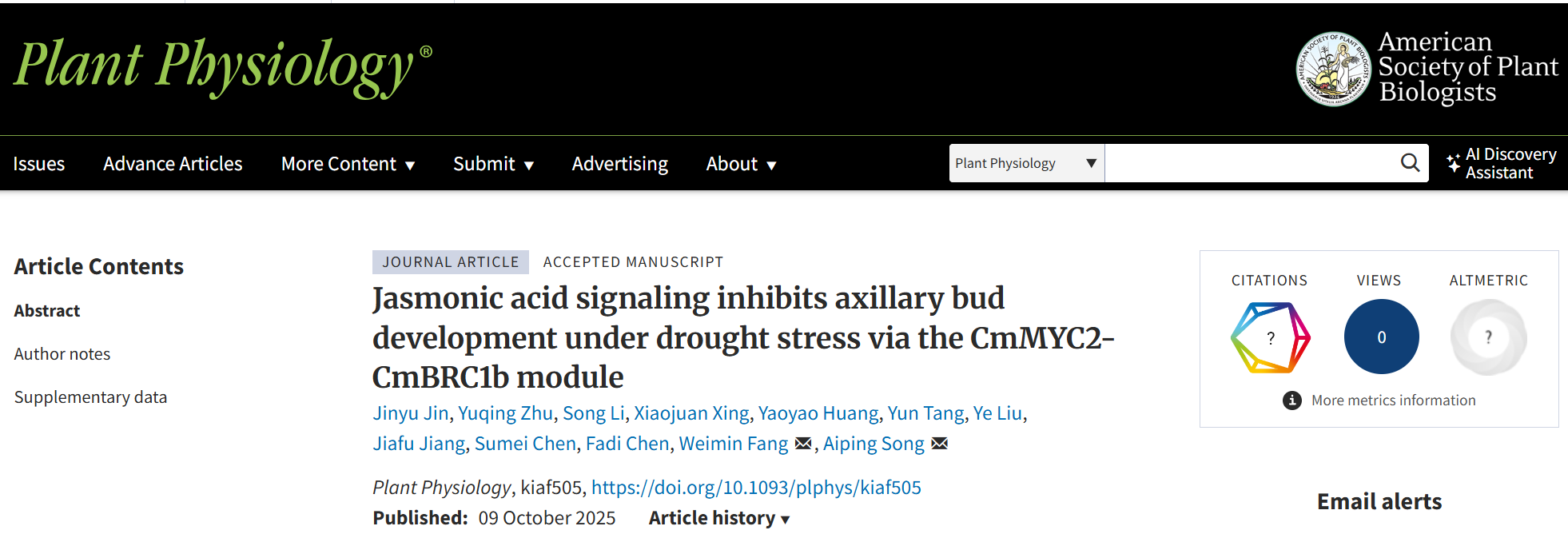 干旱是全球农业生产面临的主要环境胁迫之一,不仅限制植物的生长发育,还显著影响植物的株型塑造和分枝模式。分枝作为决定植物株型和产量潜力的关键性状,其在干旱条件下的分子调控机制仍缺乏深入解析。题为“Jasmonic acid signaling inhibits axillary bud development under drought stress via the CmMYC2-CmBRC1b module”的研究论文揭示了茉莉酸信号通过CmMYC2-CmBRC1b模块在干旱胁迫下抑制菊花分枝的分子机制。