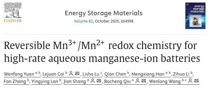 近日,理学院邱博诚教授团队在材料领域国际知名期刊《Energy Storage Materials》上发表题为“Reversible Mn³⁺/Mn²⁺ redox chemistry for high-rate aqueous manganese-ion batteries”的研究论文。该研究基于可逆Mn³⁺/Mn²⁺氧化还原化学实现高倍率水系锰离子电池,为锰离子电池在电网级储能领域的应用提供了新思路。